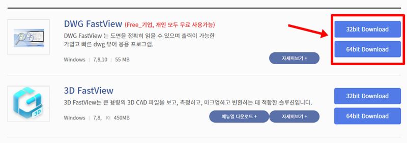 3. '뷰어' 항목 안에는 'DWG FastView'가 있습니다. 여기서 본인 컴퓨터의 운영체제에 맞는 버전을 선택해야 해요. 보통 64bit를 많이 사용하니, 잘 모르겠다면 '64bit Download'를 눌러 파일을 받아주세요.