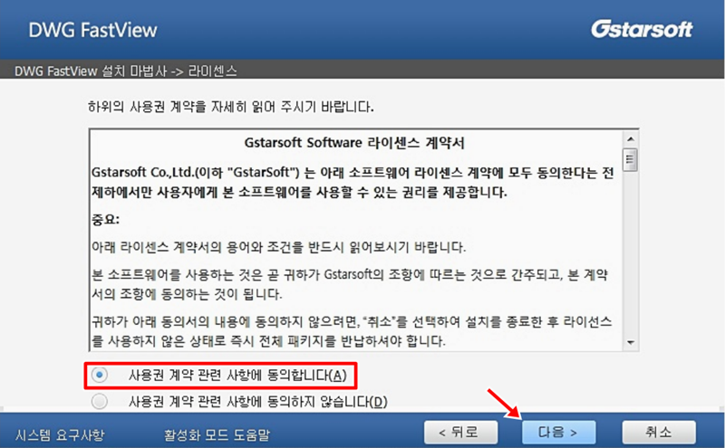 7. 설치 과정에서 사용권 계약 내용을 확인하는 단계가 나옵니다. 내용을 잘 읽어보신 후 '사용권 계약 관련 사항에 동의합니다(A)' 항목을 선택하고 오른쪽 아래에 있는 '다음'을 눌러 계속 진행합니다.