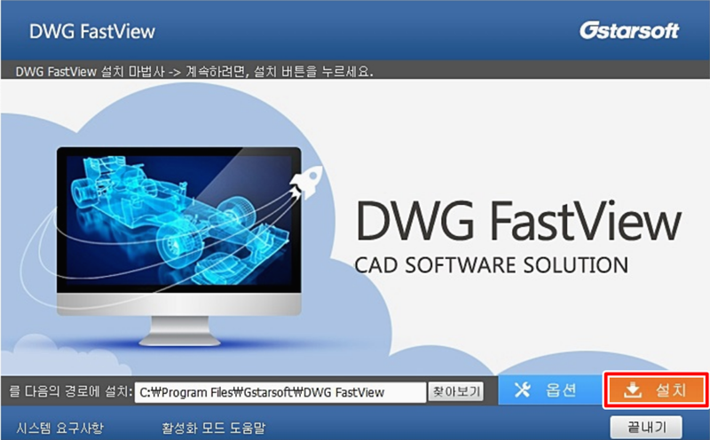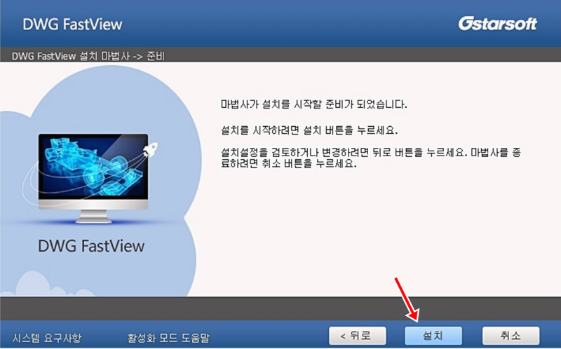 6. 이제 DWG FastView 설치 마법사가 시작됩니다. 본격적인 설치에 앞서 첫 화면이 나타나면, 화면 중앙에 보이는 컴퓨터와 로켓 그림 아래에 있는 '설치' 아이콘을 눌러주세요.