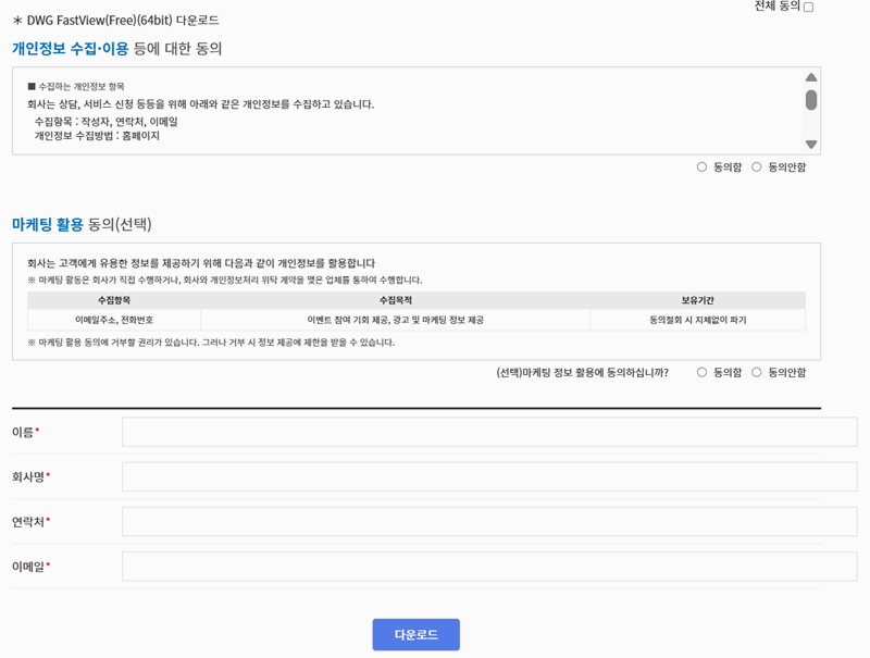 4. 내려받기를 진행하면 개인정보 수집 및 이용에 대한 동의와 함께 간단한 정보를 입력하는 화면이 나옵니다. 이름, 회사명, 연락처, 이메일 등 필수 항목을 기입하고 동의 절차를 마친 뒤 '다운로드'를 진행해 주세요.