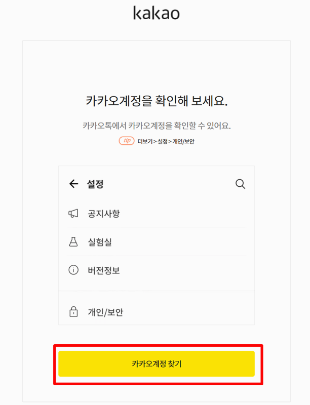 3. 카카오계정을 확인하는 페이지가 나타나면, 하단에 있는 노란색 '카카오계정 찾기'를 눌러 본격적인 찾기 과정을 시작합니다. 카카오톡 앱 내 설정에서도 확인할 수 있다는 안내도 참고할 수 있습니다.