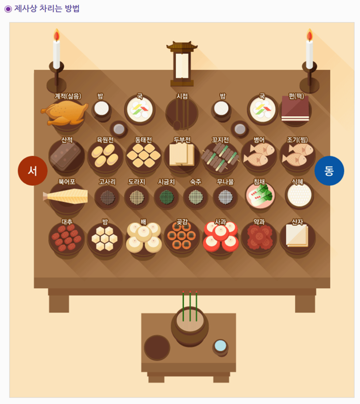 3. 상차림에는 여러 원칙이 있습니다. 예를 들어 생선은 동쪽, 육류는 서쪽에 두는 '어동육서', 생선 머리는 동쪽, 꼬리는 서쪽을 향하게 하는 '두동미서', 붉은 과일은 동쪽, 흰 과일은 서쪽에 놓는 '홍동백서' 등이 대표적인 규칙입니다.