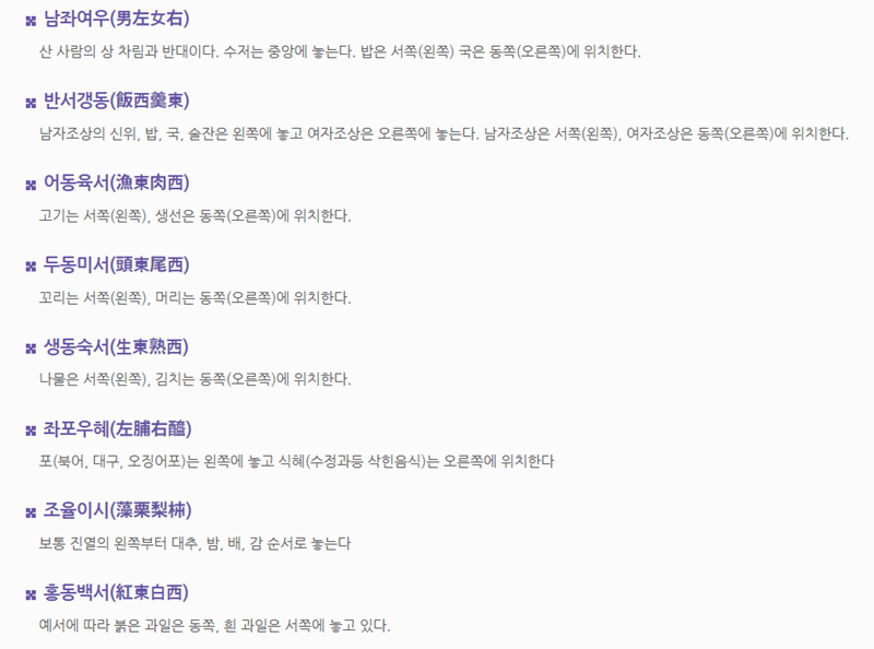 3. 상차림에는 여러 원칙이 있습니다. 예를 들어 생선은 동쪽, 육류는 서쪽에 두는 '어동육서', 생선 머리는 동쪽, 꼬리는 서쪽을 향하게 하는 '두동미서', 붉은 과일은 동쪽, 흰 과일은 서쪽에 놓는 '홍동백서' 등이 대표적인 규칙입니다.