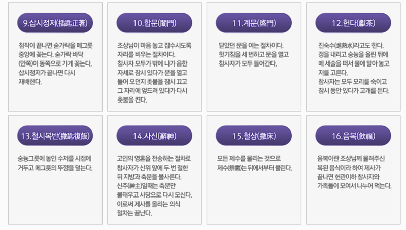 5. 이후 절차는 밥에 숟가락을 꽂는 '삽시정저'를 거쳐, 조상님께서 식사하시도록 문을 닫는 '합문', 그리고 마지막 잔을 올리는 '종헌' 등으로 계속됩니다. 마지막으로 조상님을 보내드리는 '사신'과 제사에 쓴 음식을 나눠 먹는 '음복'으로 모든 절차가 마무리됩니다.