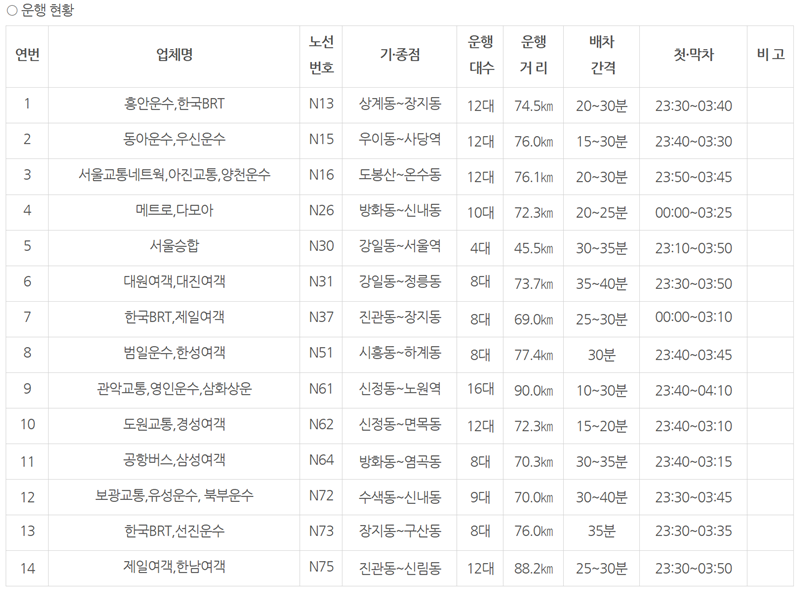 2. 각 노선별로 상세한 운행 정보를 확인할 수 있는 표입니다. N13번부터 N75번까지 노선 번호, 운행 업체, 기점과 종점, 배차 간격, 첫차 및 막차 시간이 꼼꼼하게 정리되어 있어요. 예를 들어 N61번 버스는 신정동과 노원역 사이를 10분에서 30분 간격으로 운행하는 것을 알 수 있습니다.