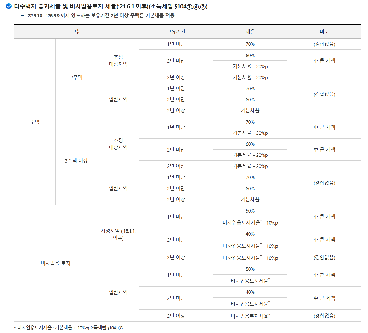 3. 과거 특정 기간(2018년 4월 1일부터 2021년 5월 31일 이전)의 다주택자 및 비사업용 토지에 대한 세율 적용 기준도 확인해 볼 수 있습니다. 조정대상지역 내 2주택자는 기본세율에 10%p, 3주택 이상자는 20%p가 추가되었습니다. 보유 기간이 1년 미만일 경우에는 일괄적으로 40%의 높은 세율이 적용되는 등 시기별로 다른 기준이 적용되었습니다.