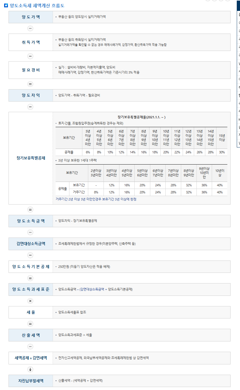 5. 양도소득세 계산 흐름을 이해하는 것도 중요합니다. 실제 판매한 금액인 '양도 가액'에서 구매 당시의 금액인 '취득 가액'과 기타 필요 경비를 빼면 '양도 차익'이 나옵니다. 여기서 오래 보유했을 경우 적용되는 '장기보유특별공제'를 차감하여 '양도소득금액'을 구하고, 기본공제를 뺀 후 세율을 곱해 최종 세액을 산출하게 됩니다.