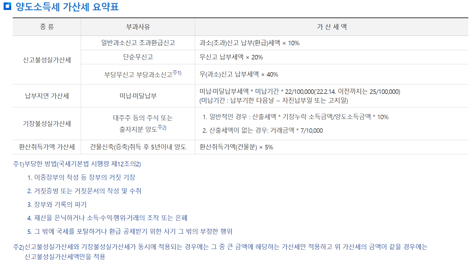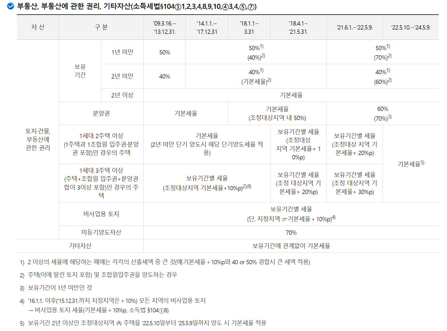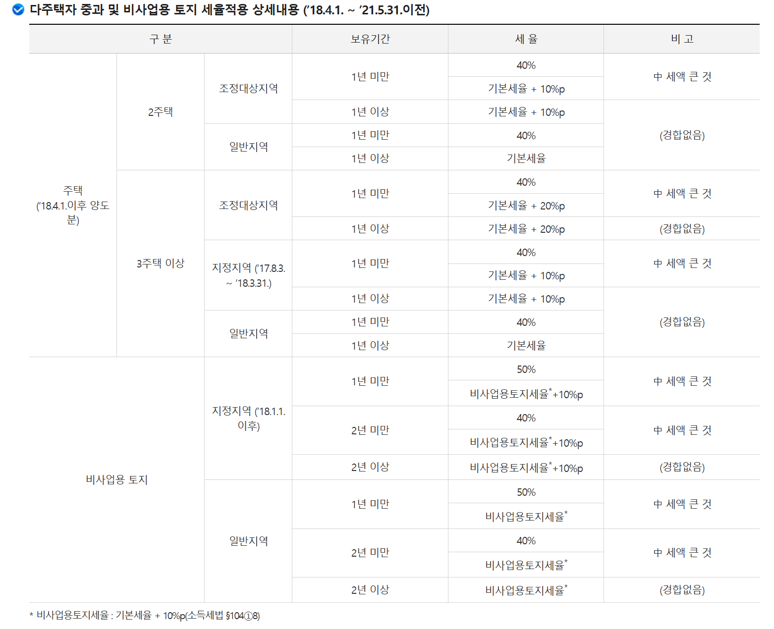 3. 과거 특정 기간(2018년 4월 1일부터 2021년 5월 31일 이전)의 다주택자 및 비사업용 토지에 대한 세율 적용 기준도 확인해 볼 수 있습니다. 조정대상지역 내 2주택자는 기본세율에 10%p, 3주택 이상자는 20%p가 추가되었습니다. 보유 기간이 1년 미만일 경우에는 일괄적으로 40%의 높은 세율이 적용되는 등 시기별로 다른 기준이 적용되었습니다.