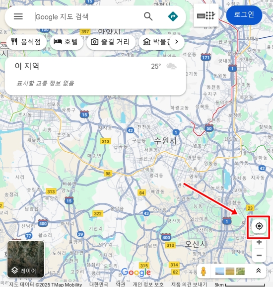 1. 지도 화면에 접속하면 오른쪽 아래에 과녁 모양의 아이콘이 보입니다. 이 아이콘이 바로 내 현재 위치를 찾아주는 역할을 합니다. 지도가 엉뚱한 곳을 비추고 있더라도 이 표시만 누르면 즉시 내가 있는 곳으로 화면이 이동합니다.