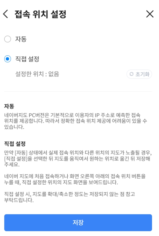 3. 만약 자동으로 잡히는 위치가 실제와 다르다면 직접 설정할 수도 있습니다. PC 버전에서는 IP 주소를 기반으로 위치를 예측하기 때문에 오차가 발생할 수 있는데, 이럴 때는 '직접 설정'을 선택하여 지도에서 정확한 위치로 옮겨 저장하면 됩니다.