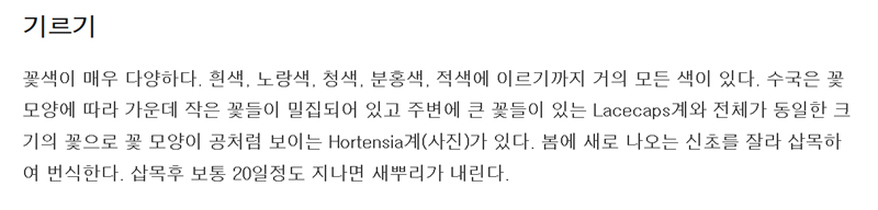 4. 수국은 흰색, 노란색, 푸른색, 분홍색 등 매우 다채로운 색의 꽃을 피웁니다. 봄에 새로 돋아나는 건강한 새순을 잘라 흙에 꽂아두는 삽목(꺾꽂이)으로 쉽게 번식시킬 수 있습니다. 흙에 꽂아두고 약 20일 정도가 지나면 새로운 뿌리가 내리기 시작합니다.