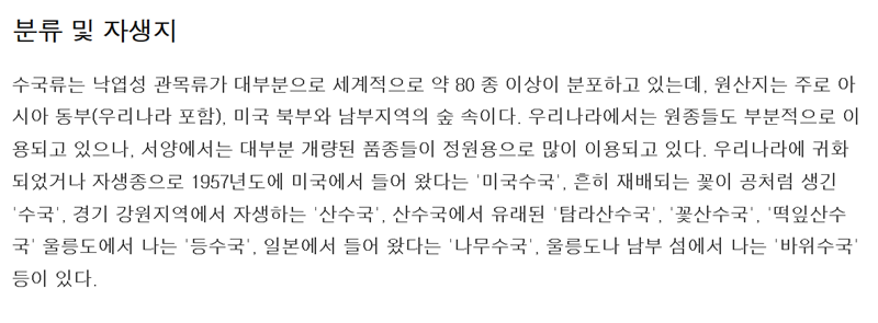 5. 전 세계적으로 약 80종 이상이 분포하며, 주로 아시아 동부와 미국 등지에 자생합니다. 우리나라에도 '미국수국', 경기 강원 지역의 '산수국', 울릉도에서 자라는 '등수국' 등 다양한 종류의 수국이 자라거나 재배되고 있습니다.