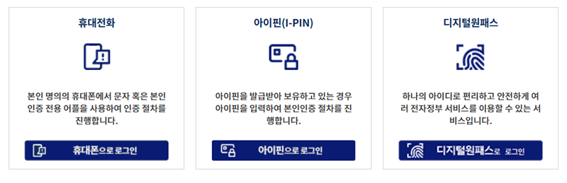 4. 신고는 본인만 가능하기 때문에 신원 확인이 필요해요. 휴대전화, 아이핀, 디지털원패스 등 세 가지 인증 방식 중 내가 사용하기 편한 것을 골라 본인 인증을 완료해 주세요.