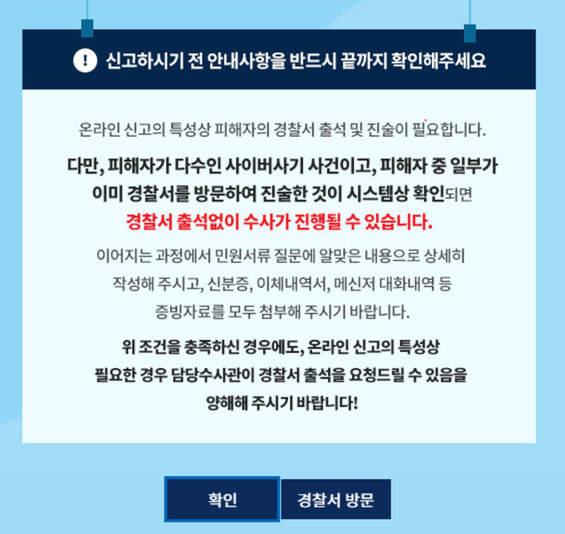2. 신고를 시작하기에 앞서, 온라인 접수 이후에도 경찰서 방문과 조사가 필요하다는 전체적인 절차 안내가 나타나요. 내용을 확인한 뒤 아래의 '확인'을 눌러 다음 단계로 진행해 주세요.