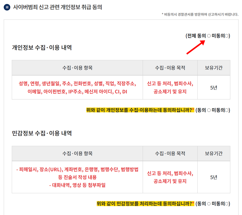 3. 개인정보 수집 및 이용에 대한 동의 절차가 필요해요. 신고 처리와 수사를 위해 필요한 정보들이므로, 각 항목의 내용을 읽어본 후 '전체 동의'에 표시하여 과정을 이어나가 주세요.