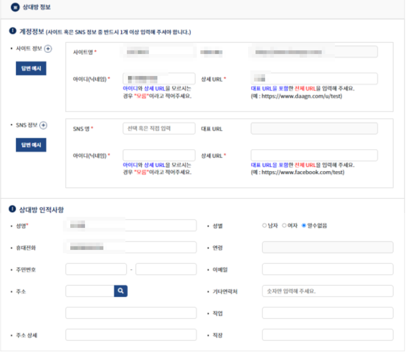 11. 마지막으로 상대방에 대해 알고 있는 정보를 입력하는 부분이에요. 상대방이 활동한 사이트 정보나 아이디, SNS 계정, 그리고 알고 있는 인적 사항이 있다면 최대한 자세하게 적어주는 것이 좋아요.