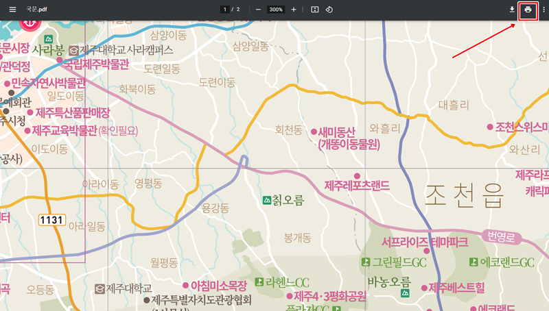 5. 지도의 내용을 충분히 확인했다면, 이제 인쇄를 준비할 차례입니다. 화면 오른쪽 위에 보이는 여러 아이콘 중에서 프린터 모양의 아이콘을 찾아서 눌러주세요.