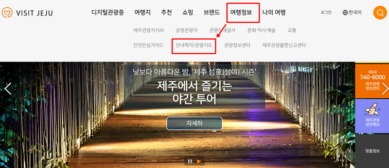 1. 비짓제주 홈페이지에 접속한 다음 상단 메뉴에서 '여행정보' 항목을 살펴본 후, 나타나는 목록 중 '안내책자/관광지도'를 찾아서 들어가 주세요. 이곳에서 제주 여행에 필요한 다양한 자료들을 확인할 수 있습니다.