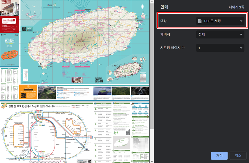 6. 인쇄 아이콘을 누르면 인쇄 설정 창이 나타납니다. 여기서 사용할 프린터를 정하거나, PDF 파일 형태로 컴퓨터에 보관할 수도 있습니다. 전체 페이지를 인쇄할지 특정 페이지만 할지 정하고 저장하면 됩니다.