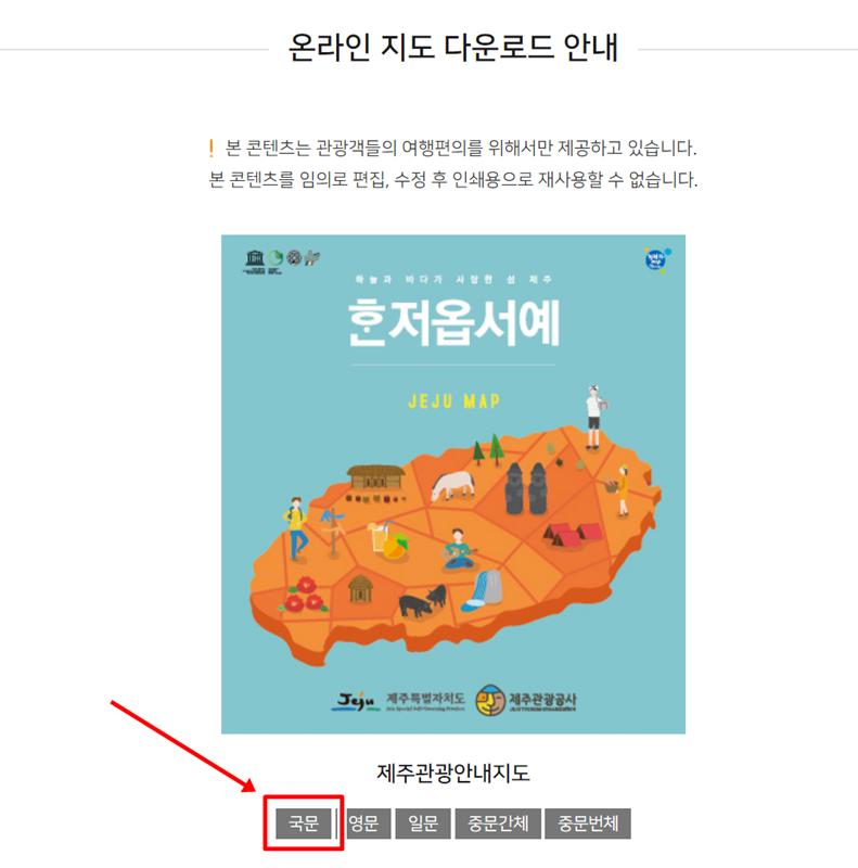 3. 온라인 지도 내려받기 안내 아래에 있는 제주관광안내지도 미리보기 이미지를 확인할 수 있습니다. 바로 아래 '국문'이라고 쓰인 부분을 선택하면 한국어 지도를 바로 열어볼 수 있어요.
