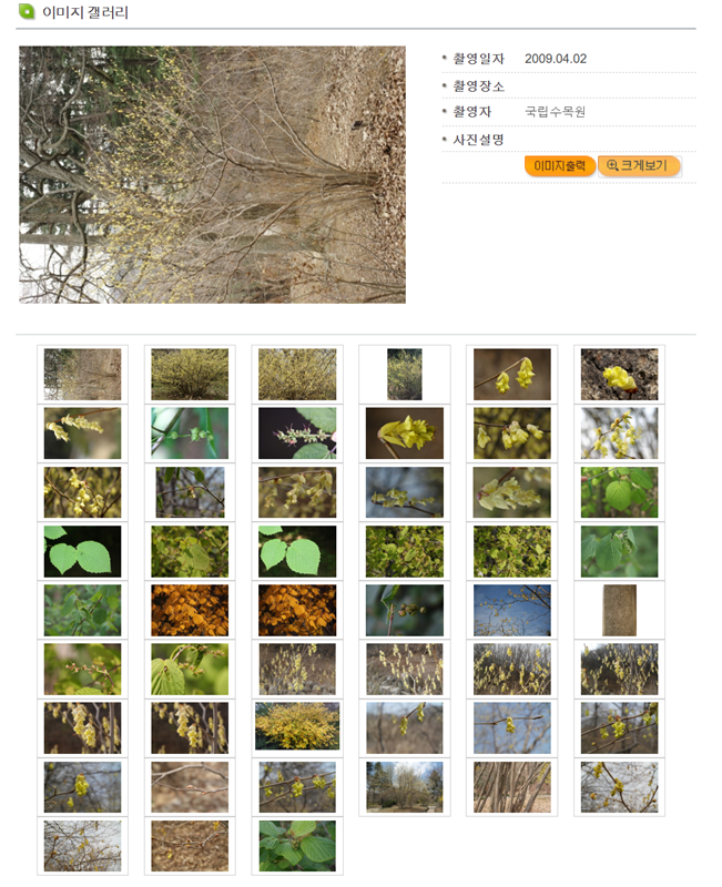 6. 궁금한 식물을 발견했다면 목록에서 해당 식물의 이름을 선택하여 상세 정보 페이지로 들어갑니다. 예를 들어 '히어리'를 선택하면 국명, 학명과 함께 영문명 'Korean winter hazel'을 확인할 수 있습니다. 또한, 식물의 형태, 분포, 생육환경 등 자세한 설명도 함께 볼 수 있어 유용합니다.