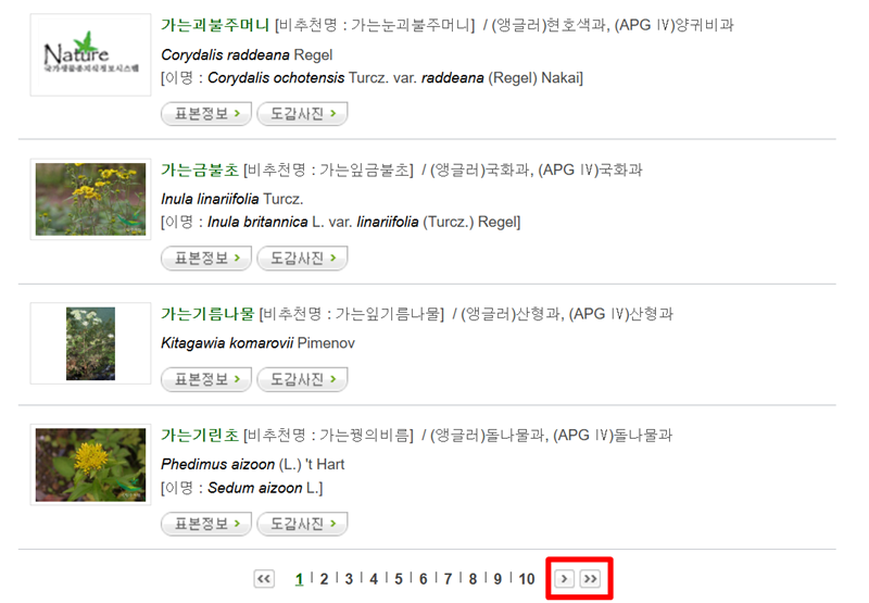 4. 페이지 하단에 있는 페이지 번호나 화살표를 이용해 다른 페이지로 넘어갈 수 있습니다. 목록이 워낙 방대하기 때문에, '다음' 화살표(>>)를 이용하면 목록의 뒷부분으로 빠르게 이동하며 다양한 식물들을 둘러볼 수 있습니다. 이를 통해 여러 페이지에 걸쳐 있는 식물 정보를 효율적으로 탐색할 수 있습니다.