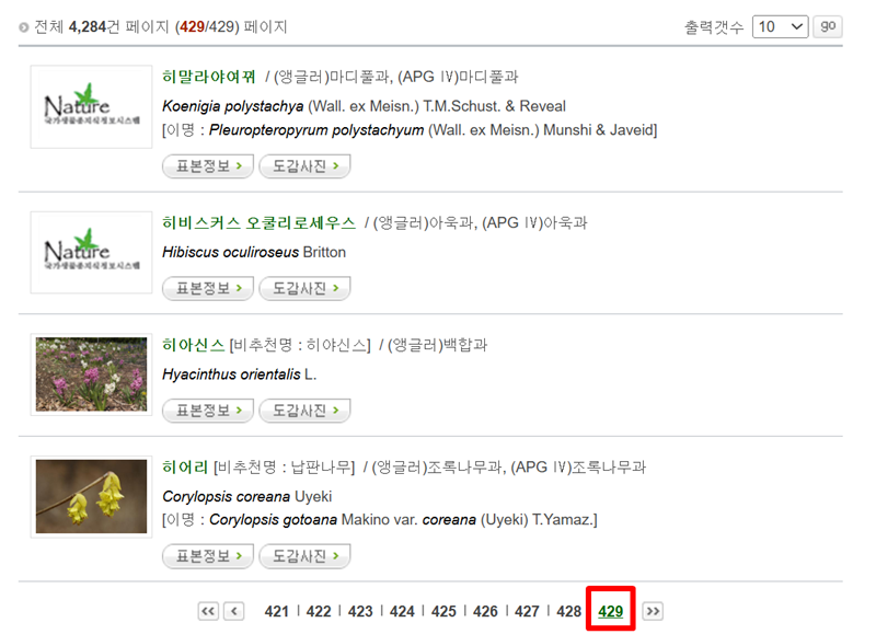 3. '식물도감'에 들어서면 가나다순으로 정렬된 수많은 식물의 목록을 마주하게 됩니다. 현재 총 4,284종의 식물 정보가 429페이지에 걸쳐 등록되어 있는 것을 확인할 수 있습니다. 우리나라의 식물 다양성이 얼마나 풍부한지 한눈에 실감할 수 있는 부분으로, 방대한 자료 속에서 원하는 정보를 찾아볼 수 있습니다.