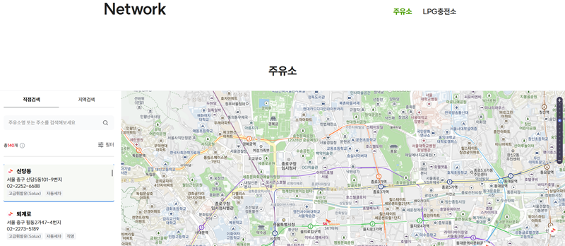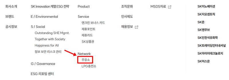 5. 이제 카드를 발급받을 주유소를 찾아볼 차례입니다. 다시 'Business' 메뉴로 돌아가 이번에는 'Network' 항목 아래에 있는 '주유소'를 선택해 주세요. 이 기능을 통해 주변에 있는 SK 주유소를 쉽게 찾을 수 있습니다.