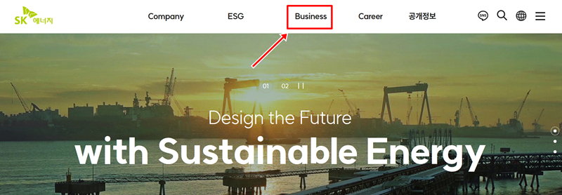 1. 먼저 홈페이지 상단에 보이는 'Business' 메뉴로 시선을 옮겨보세요. SK에너지가 진행하는 다양한 사업 분야에 대한 정보가 모여있는 곳으로, 카드 관련 안내도 이곳에서 시작됩니다.