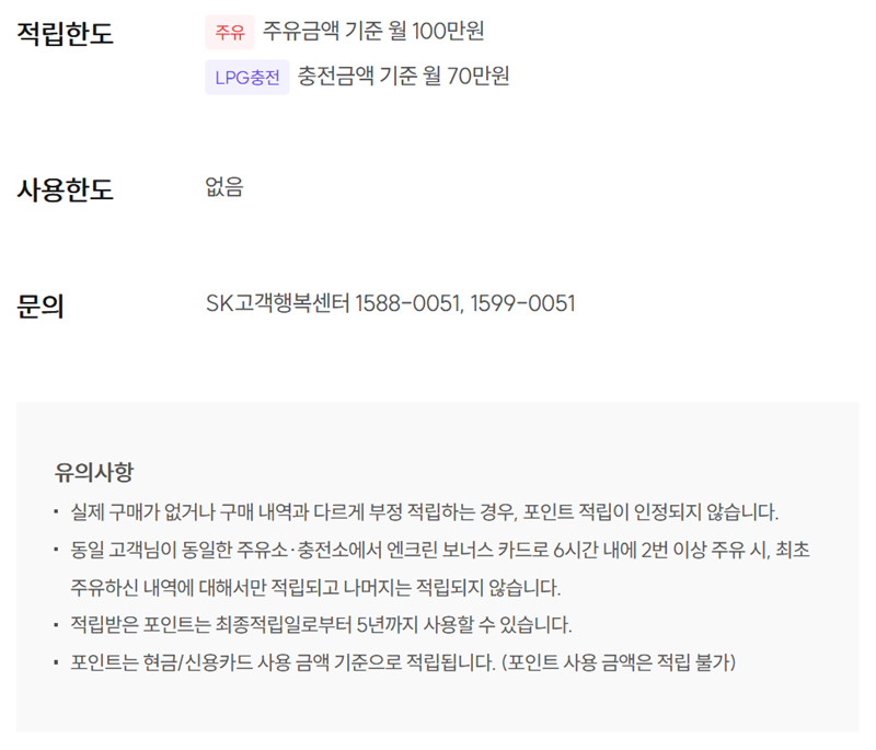 4. 같은 페이지에서 화면을 조금 아래로 내리면 더 상세한 정보들을 볼 수 있습니다. 월간 적립 한도가 얼마인지, 적립된 포인트의 유효기간은 언제까지인지(최종 적립일로부터 5년) 등 알아두면 유용한 내용들을 미리 확인해두는 것이 좋습니다.