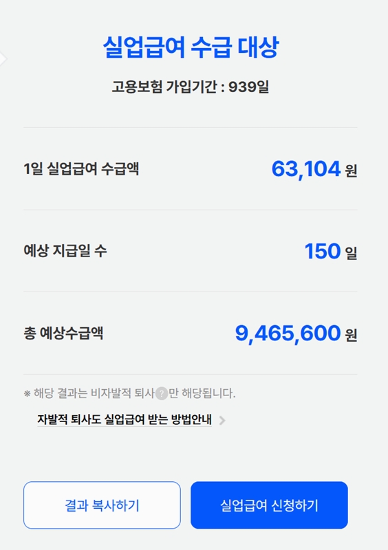 2. 실업급여를 받기 위한 조건으로는 가입 기간이 180일 이상이어야 하고 일할 의사와 능력이 있으나 취업하지 못한 상태여야 합니다. 충족이 된다면 수급 대상이라고 표시가 되며 수급액 및 예상 지급일 수가 표시 됩니다. 다만 대상이 되기 위해서는 재취업을 위한 노력을 계속하고 비자발적인 퇴사였어야 하며 퇴사일의 다음 날로부터 12개월 내에 실업급여를 신청해야 합니다.