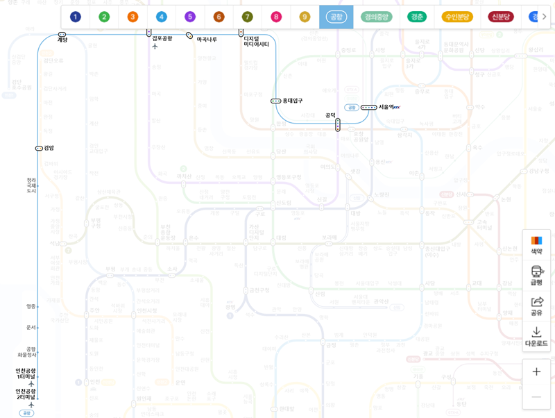 3. 공항철도를 선택하면 해당 노선이 선명하게 표시됩니다. 서울역에서 시작해 홍대입구, 김포공항을 거쳐 인천공항 터미널까지 이어지는 전체 경로와 다른 노선으로 갈아탈 수 있는 환승역들을 한눈에 파악할 수 있어 동선을 계획하기 좋습니다.