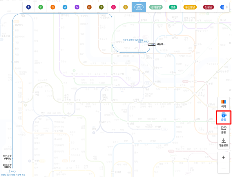 2. 노선도 화면으로 바뀌면 수도권의 모든 전철 노선이 나타납니다. 여기서 상단에 보이는 여러 노선 중 '공항'이라고 표시된 부분을 선택하면, 인천국제공항철도 노선을 중심으로 지도가 정리되어 한결 수월하게 경로를 확인할 수 있습니다.