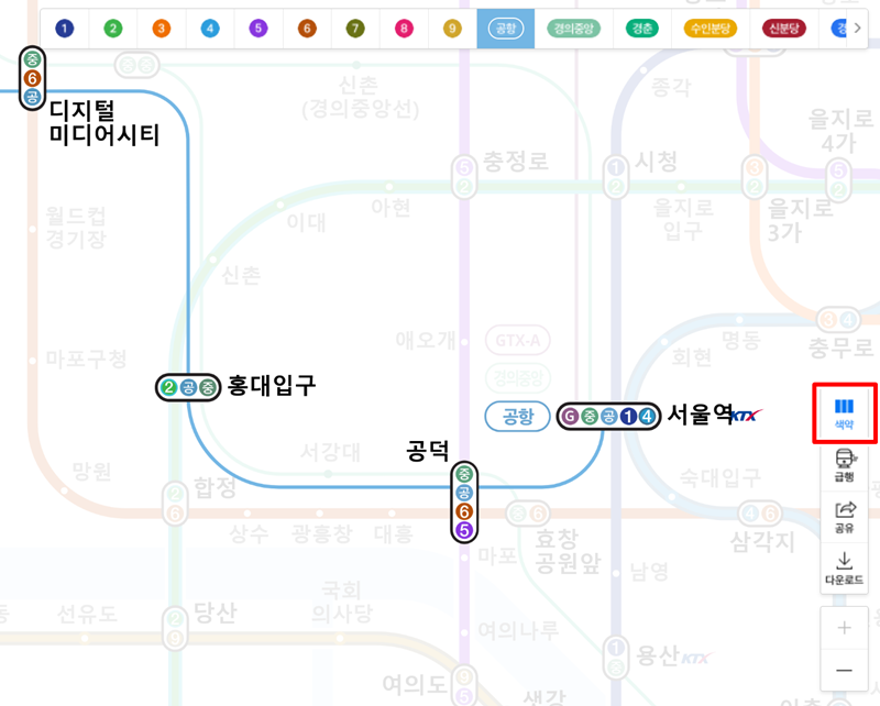5. 오른쪽 메뉴에는 '색약'이라는 편의 기능도 마련되어 있습니다. 이 기능을 활성화하면 노선도의 색상이 변경되어 색 구분에 어려움을 느끼는 분들도 각 노선을 더 명확하게 식별하고 편안하게 노선도를 이용할 수 있도록 도와줍니다.