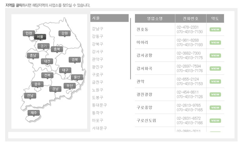 4. 검색창을 이용하는 대신, 바로 아래에 있는 지도에서 원하는 지역을 직접 선택하는 방법도 있습니다. 예를 들어 지도에서 '서울'을 선택하면 왼쪽에 강남구, 강동구 등 자치구 목록이 나타나고, 원하는 구를 선택하면 오른쪽에 해당 지역의 영업소명, 전화번호, 약도 정보가 표시됩니다.