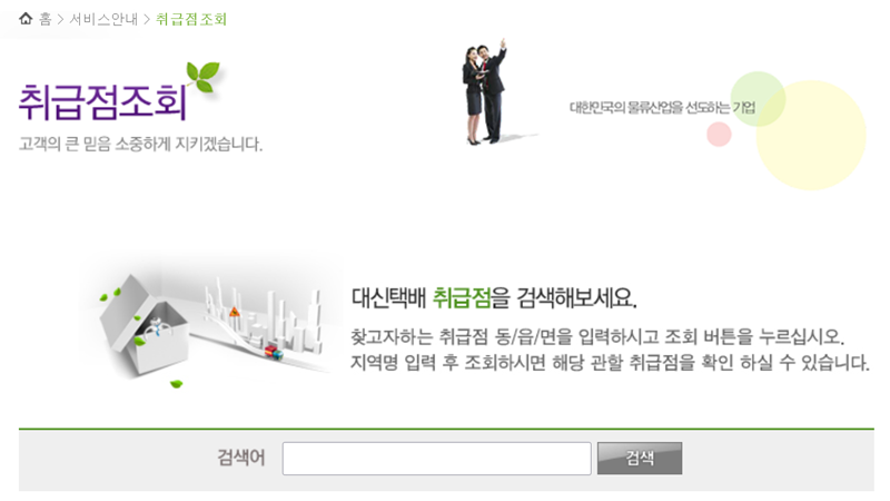 3. 취급점조회 페이지로 이동하면 '대신택배 취급점을 검색해보세요'라는 안내와 함께 검색창이 나타납니다. 찾고자 하는 영업점이 있는 동, 읍, 면 단위를 입력한 후 '검색'을 누르면 해당 지역의 영업소를 조회할 수 있습니다.