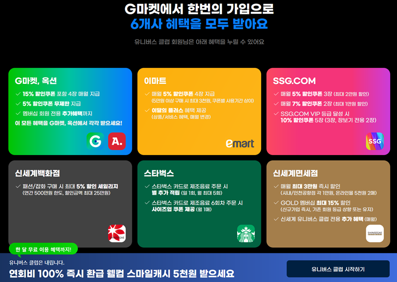 7. '유니버스 클럽'은 G마켓을 더욱 알차게 이용할 수 있는 멤버십 프로그램이에요. 한번의 가입으로 G마켓뿐만 아니라 신세계 그룹의 여러 쇼핑 공간에서 함께 더 커진 혜택을 누릴 수 있어 많은 이용자들의 관심을 받고 있습니다.