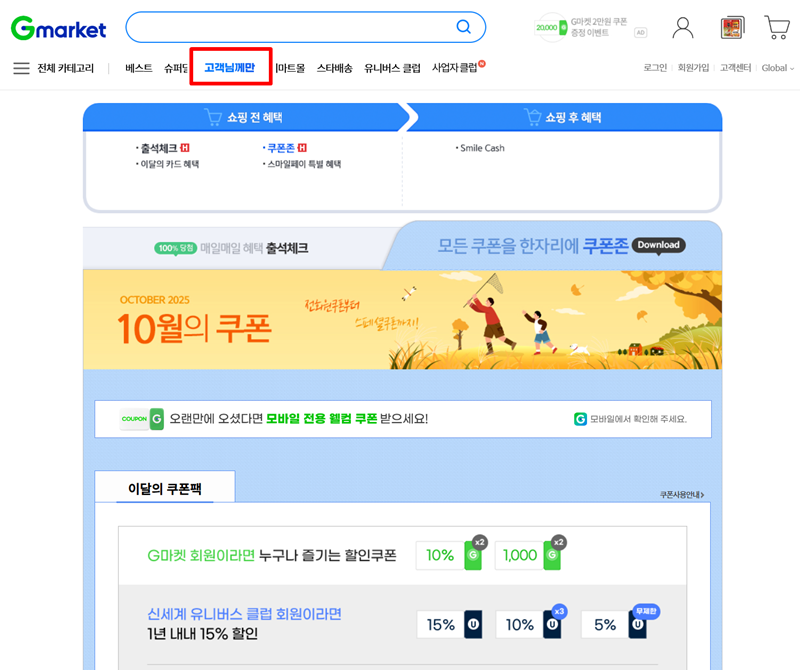 5. '고객님께만' 코너에서는 나를 위해 준비된 특별한 혜택들을 확인할 수 있어요. 매일 참여할 수 있는 출석체크 이벤트나 달마다 새롭게 열리는 쿠폰 꾸러미처럼, 조금만 신경 쓰면 쇼핑을 더욱 풍요롭게 만들어주는 즐거운 소식들이 기다리고 있습니다.