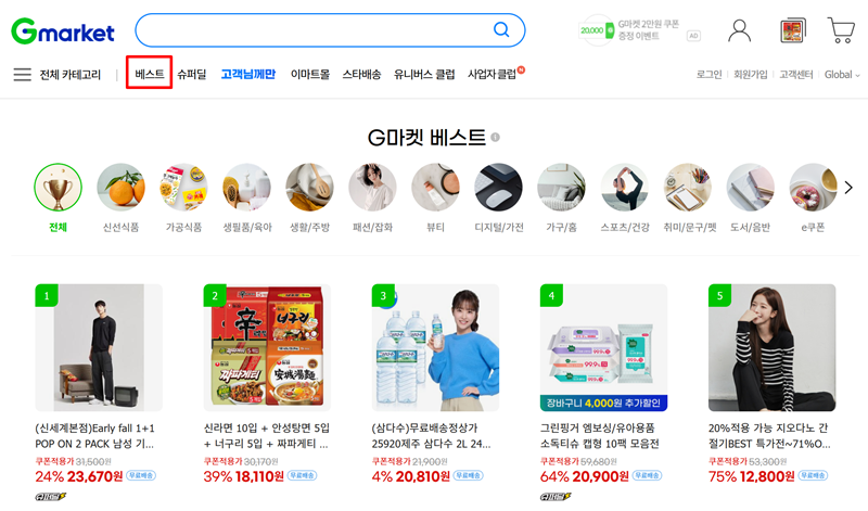 2. '베스트' 코너로 이동하면 지금 가장 많은 사랑을 받고 있는 상품들을 순위별로 확인할 수 있어요. 신선식품부터 가공식품, 생활용품, 패션, 뷰티에 이르기까지 분야별로 인기 상품이 정리되어 있어 쇼핑 트렌드를 파악하고 좋은 물건을 고르기에도 수월하답니다.