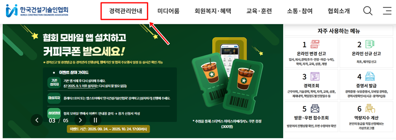 1. 한국건설기술인협회 홈페이지에 들어간 후, 상단 메뉴에서 '경력관리안내'를 찾아 이동합니다. 이곳에서 경력 신고, 변경, 증명서 발급 등 기술인의 경력과 관련된 전반적인 민원 업무 안내를 확인할 수 있습니다.