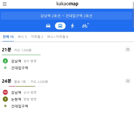 6. 대중교통을 선택하면 가장 빠른 경로부터 환승이 적은 경로까지 여러 가지 선택지를 보여줍니다. 지하철 2호선을 이용하면 환승 없이 21분 만에 도착할 수 있고, 다른 노선으로 환승하는 경로는 24분이 걸린다는 식으로 비교하며 고를 수 있어요.