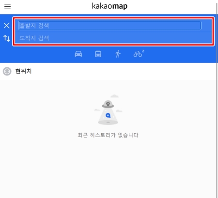 3. 길찾기 화면으로 전환되면 '출발지 검색'과 '도착지 검색'을 할 수 있는 입력창이 나타납니다. 이곳에 내가 출발하려는 장소와 도착해야 할 장소의 이름이나 주소를 정확하게 입력해 주면 됩니다.