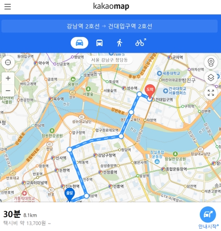 5. 자동차를 선택하면 추천 경로가 지도 위에 파란 선으로 표시돼요. 예를 들어 강남역에서 건대입구역까지의 경로는 약 30분이 소요되며, 거리는 8.1km, 예상 택시비는 약 13,700원이라는 상세한 정보까지 한눈에 파악할 수 있어 편리합니다.