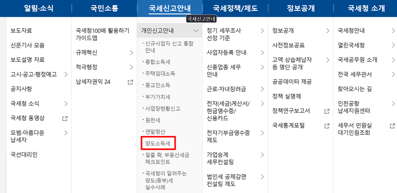 2. '국세신고안내'에 속해 있는 여러 세금 항목 중에서 '개인신고안내' 아래에 있는 '양도소득세'를 선택합니다. 그러면 양도소득세에 대한 전반적인 개요부터 신고 방법까지 다양한 정보를 한눈에 파악할 수 있는 페이지로 연결됩니다.