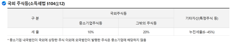 6. 국내 주식뿐만 아니라 국외 주식에 대한 양도소득세율 정보도 찾아볼 수 있습니다. 중소기업 주식과 그 외 주식으로 구분하여 각각 다른 세율이 적용되며, 기타자산에 대한 누진세율 정보도 함께 안내되어 있습니다.