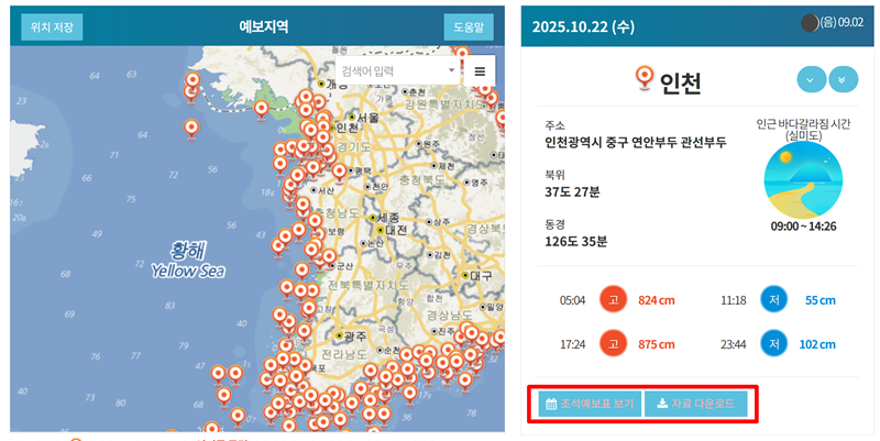 3. 검색을 마치면 선택한 '인천' 지역의 오늘 날짜 기준 물때 정보가 나타납니다. 고조(물이 가장 높은 때)와 저조(물이 가장 낮은 때) 시각 및 해수면 높이를 한눈에 볼 수 있습니다. 더 자세한 월별 달력 형태나 주간 정보를 보고 싶다면 아래의 '조석예보표 보기'나 '자료 다운로드'를 활용하면 됩니다.