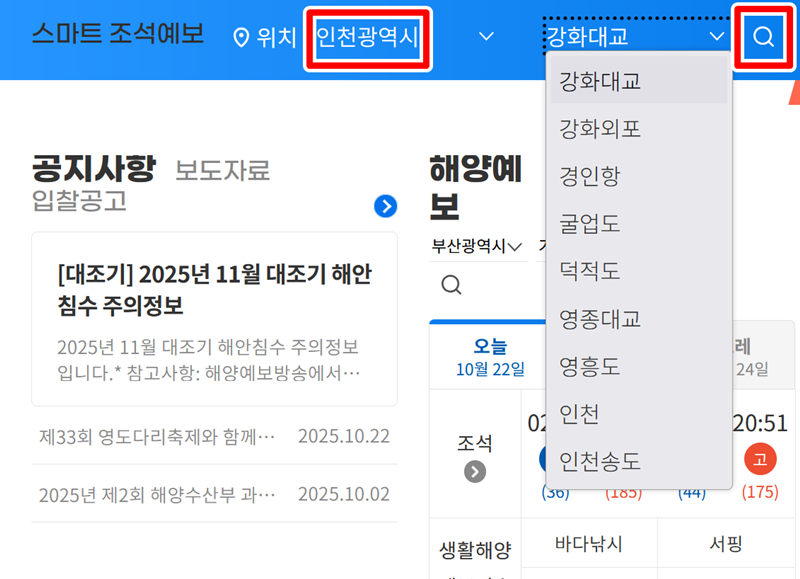 2. 지역을 선택하는 부분을 눌러 '인천광역시'와 같이 원하는 시/도 단위를 먼저 고릅니다. 그다음 '강화대교'처럼 더 세부적인 관측 장소를 선택한 후, 오른쪽에 있는 돋보기 모양의 검색 아이콘을 눌러주면 해당 지역의 정보를 바로 조회할 수 있습니다.