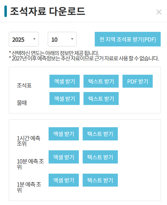 5. 만약 물때 정보를 파일로 저장하고 싶다면 '자료 다운로드'를 선택하면 됩니다. 원하는 연도와 월을 지정한 후, 엑셀, 텍스트, PDF 등 필요한 파일 형식으로 내려받을 수 있습니다. 조석표뿐만 아니라 1시간, 10분, 1분 단위의 예측 조위 자료까지 상세하게 받을 수 있습니다.