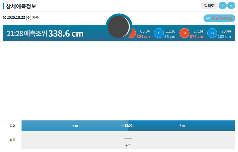 7. 현재 시점의 예측 조위나 파고, 날씨 등 더 상세한 정보가 필요하다면 '상세예측정보'를 살펴보면 됩니다. 실시간에 가까운 해수면 높이 정보를 그래프와 수치로 정확하게 보여주어 현재 바다 상황을 파악하는 데 큰 도움이 됩니다.