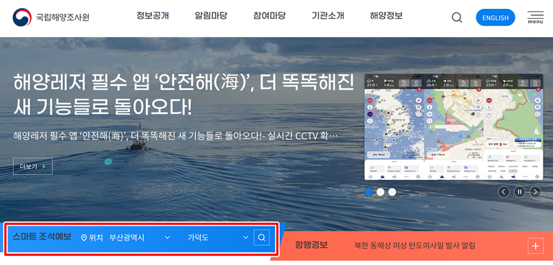 1. 국립해양조사원 홈페이지에 접속하면 메인 화면에서 '스마트 조석예보'라는 부분을 바로 찾을 수 있습니다. 이곳에서 원하는 지역을 직접 선택하여 간편하게 물때 정보를 확인할 수 있습니다. 처음에는 '부산광역시'로 설정되어 있지만, 원하는 지역으로 변경할 수 있습니다.